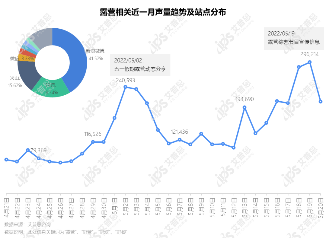据艾普思自建搜索引擎数据,2022年4月21日至2022年5月20日,露营相关声量为415.53万余条;监测时间内,露营声量峰值分别在5月2日和5月19日出现,5月2日声量主要为网民在新浪微博、抖音和火山分享的五一假期露营动态;5月19日前后露营声量则主要为新浪微博上有关“丁程鑫加盟花儿与少年”、“王源加盟一起露营吧”的宣传信息。